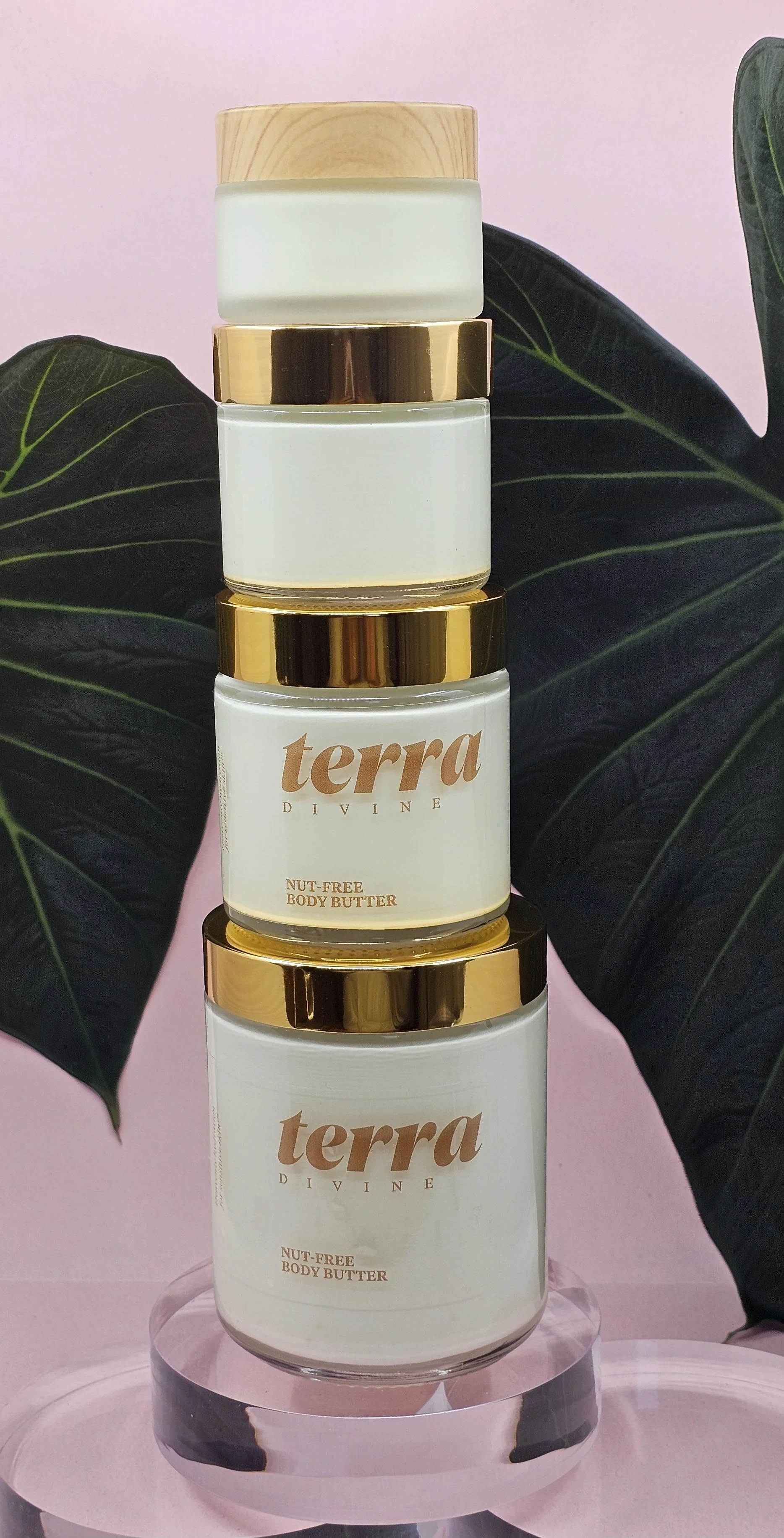 Terra and I have been making body butter together in the kitchen for years. Years of research and countless kitchen experiments led to the creation of Terra Divine's Nut-Free Body Butter. This unique formula, crafted with just five simple botanicals, is free of nuts and safe for even the most sensitive skin.